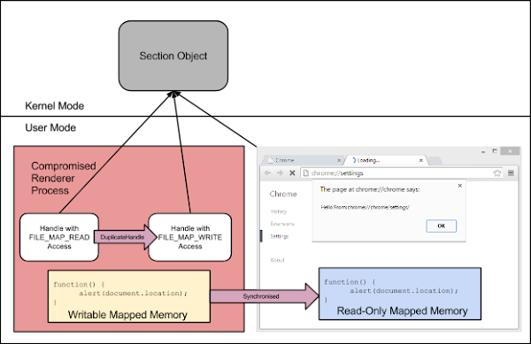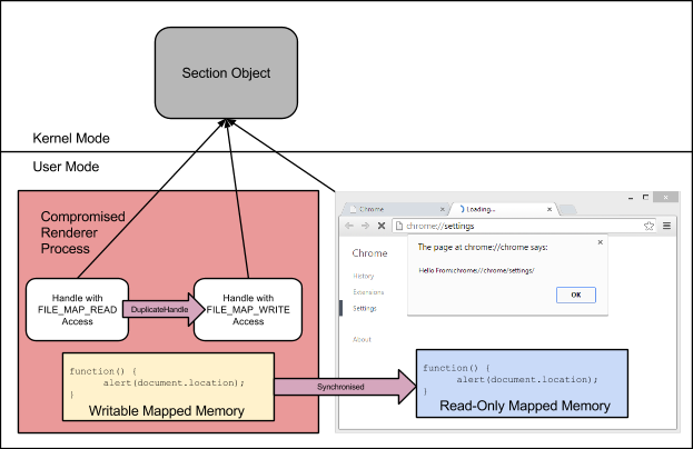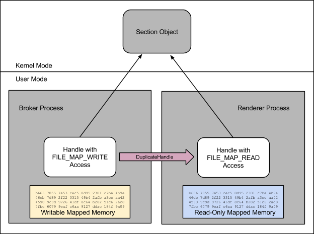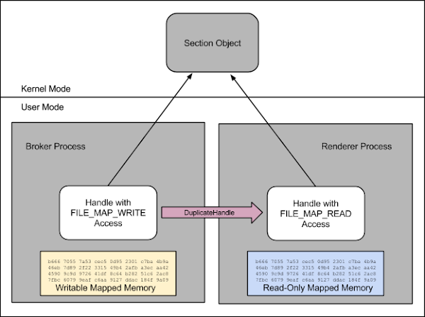 When the broker process shares the section read-only it uses the DuplicateHandle API to create a new handle in the sandboxed renderer process. It specifies FILE_MAP_READ as the desired permissions so that is all the permissions assigned to the renderer. Now because of the NT security model the renderer process shouldn't be able to re-open the section with write access as the process runs with virtually no permissions in its Token. You'd think that was the case but it turns out not to be. When Chrome created the original section it never supplied a name, it turns out section objects with NO names also have NO security. Surprise!