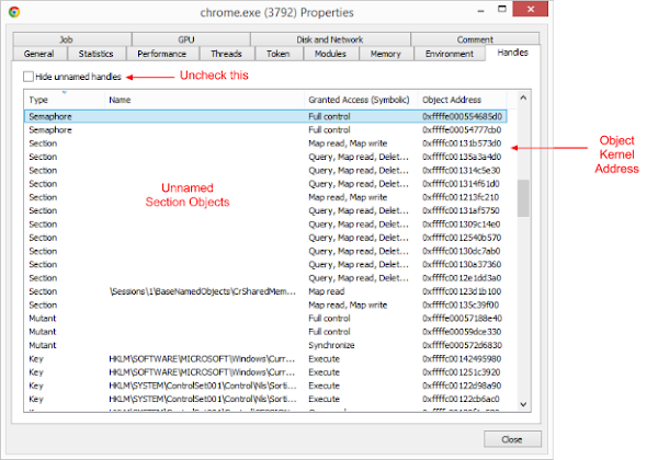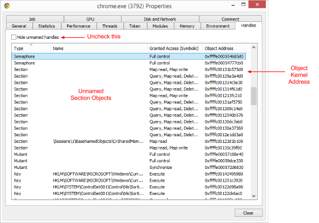 One final note on how you might find similar issues in other applications. Remember that even though each process has different handles, each refers to the same section object in the kernel. A quick way to check on this is to use a tool such as Process Hacker or Process Explorer and look at the handle table. While not the default you can add the Object Address column to the table, you can then use this information when looking at unnamed sections to determine if any are shared with a more privileged process, and whether any sections are only granted FILE_MAP_READ permissions in the low-privileged process.