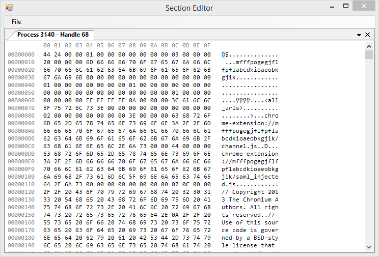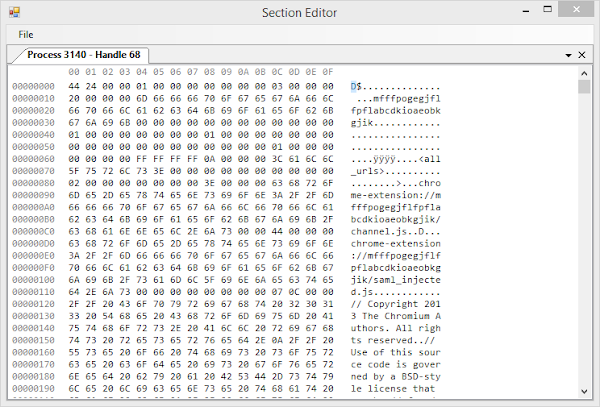 Okay so how might we exploit this in practice? Turns out there was actually only one user of the ShareReadOnlyToProcess method at the time. It was part of the code which shared extension scripts between renderer processes (see user_script_loader.cc). For reasons of efficiency these scripts were shared read-only to the renderers and relied on the OS enforcing this read-only property of the sections to prevent the renderers modifying the contents. On Linux/OSX this works but due to the issue I’ve just described it didn't work so well on Windows. The contents of the section looked like the image below, it contained a pickled version of the script and extension information.