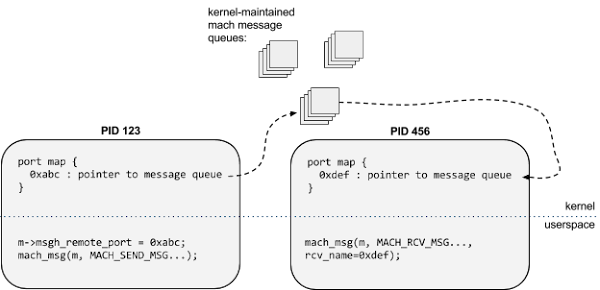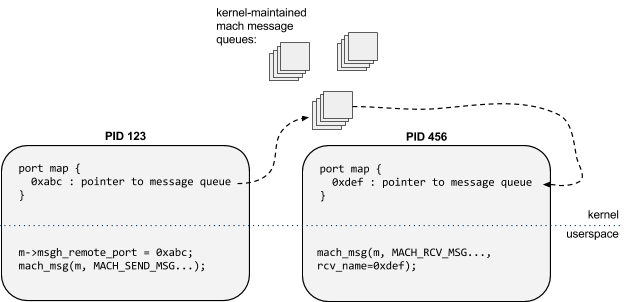 When the process with PID 456 tries to dequeue a message using the mach port name 0xdef the kernel uses 0xdef to index that process’s map of mach ports such that it can find the correct message queue from which to dequeue a message.