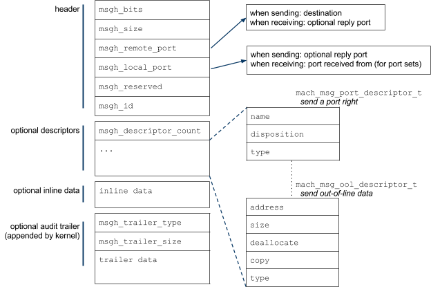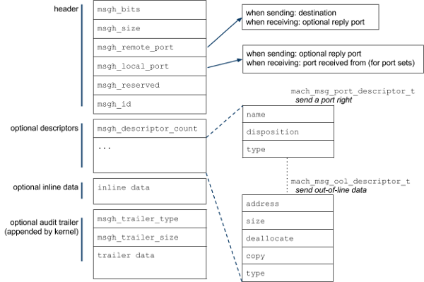 If you want to change the permissions of a memory mapping in your process, talk to a device driver, render a system font, symbolize a crash dump, debug another process or determine the current network connectivity status then on OS X behind the scenes you’re really sending and receiving mach messages. In order to find and exploit bugs in all those things it’s important to understand how mach IPC works: