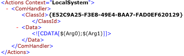 Finally we can check whether a normal user can pass any arguments to the task by checking the XML task file. In the case of WSTask it uses a custom COM handler, but allows the user to specify two command line arguments. This results in the executable c:\windows\system32\taskhost.exe executing with an arbitrary command line as the local system user.