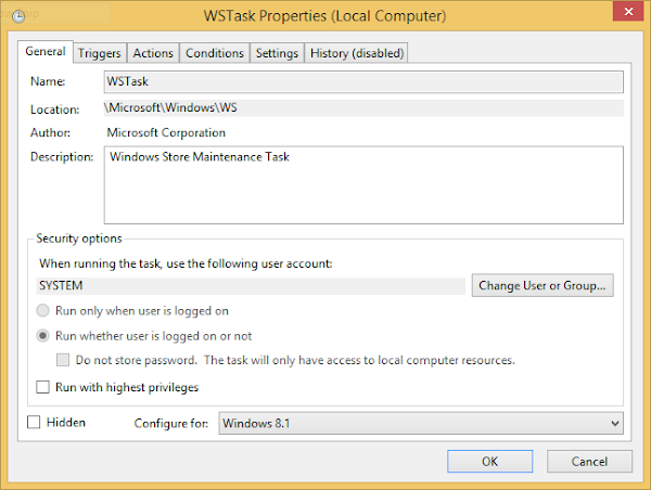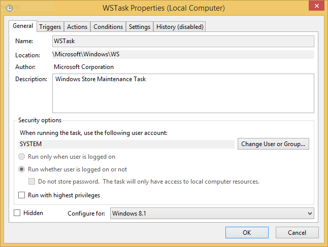 As there was some confusion on whether this was only a UAC bypass I decided to spend a little time to develop a new PoC which gets local system privileges without any reliance on UAC. Sometimes I enjoy writing exploits, if only to prove that it can be done. To convert the original PoC to one which gets local system privileges I need a different application to redirect. I decided the most likely target was a registered scheduled task as you can sometimes pass arbitrary arguments to the task handler process. So we’ve got three criteria for the ideal task, a normal user must be able to start it, it must result in a process starting as local system and that process must have an arbitrary command line specified by the user. After a bit of searching I found the ideal candidate, the Windows Store Maintenance Task. As we can see if runs as the local system user.