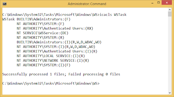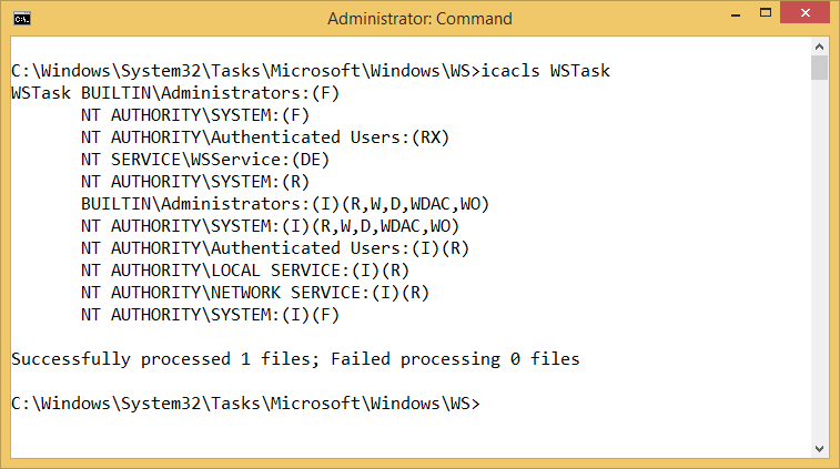 We can determine that a normal user can start it by looking at the task file’s DACL using a tool such as icacls. Notice the entry in the following screenshot for NT AUTHORITY\Authenticated Users with Read and Execute (RX) permissions.