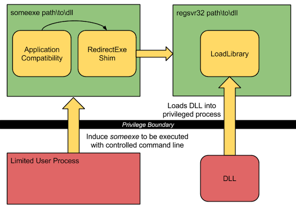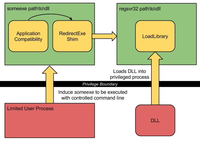 I built a copy of the SDB explorer tool (available from here) so that I could dump the existing database looking for any useful existing shim. I found that for 32 bit there’s a shim which will cause a process to start the executable regsvr32.exe passing the original command line. This tool will load a DLL passed on the command line and execute specific exported methods, if we could control the command line of a privileged process we could redirect it and elevate privileges.