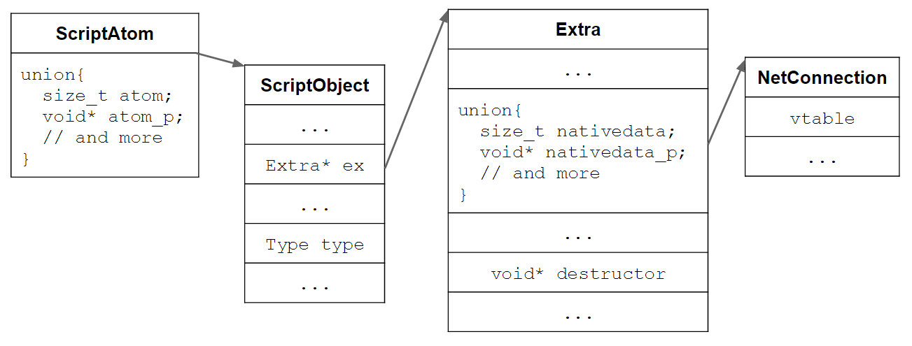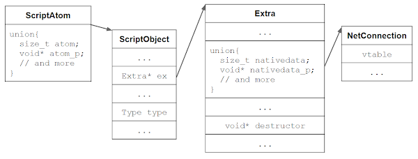 AS2 objects are backed by a number of native structures. Typically, an AS2 object is referenced by a pointer-width structure called a ScriptAtom, which contains a pointer (or other data for primitives that are not objects). The pointer points to a native ScriptObject that is common to all AS2 classes, and that object contains a several properties (with some indirection), including the native data and the type of the object. Like an atom, the native data can contain object data (for example, the value of a boolean object) or a pointer to a native class that backs the specific object type. The interpretation of the native data is based on the type property of the ScriptObject. The diagram above shows a NetConnection object, where the native data is a pointer to a native NetConnection object.