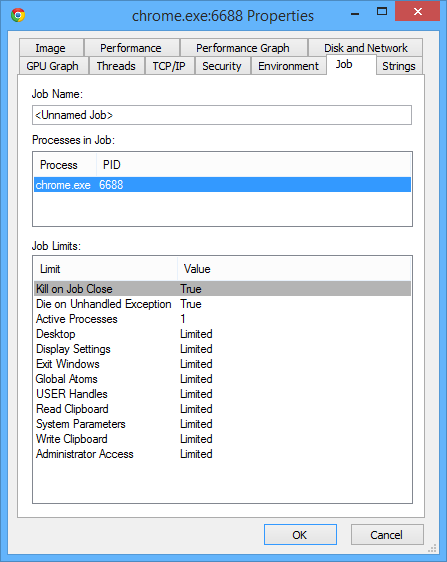 Let’s first describe what a Job object on Windows actually is and what Chrome uses it for. Strictly speaking, a Job object isn’t a security feature at all; instead, it is a way of grouping related processes together and restricting the type and amount of common resources the processes are allowed to use. If you’re from a Unix background it’s similar to ulimit, but in many ways more powerful. In certain circumstances you can use it to restrict what a process can do; for example, Chrome renderers have the following Job object set: