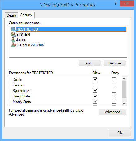 What this code does is create the process, then it creates a new handle to the current console device object so it can pass it on the command line to the conhost process. Looking at the control flow about the only way the process could be terminated in the way we observed (with ZwTerminateProcess) is if ObOpenObjectByPointer returns STATUS_ACCESS_DENIED when trying to create a new handle. But how can that be, we opened the device file originally, shouldn’t it also be able to be reopened with the same access rights? Well no, because the FILE_OBJECT has an associated Security Descriptor and the DACL doesn’t give our heavily restrictive token GENERIC_ALL access. As we can see in the following screenshot we’re missing an entry for the renderer’s token restricted SID (S-1-0-0) which would allow the restricted token check to succeed.