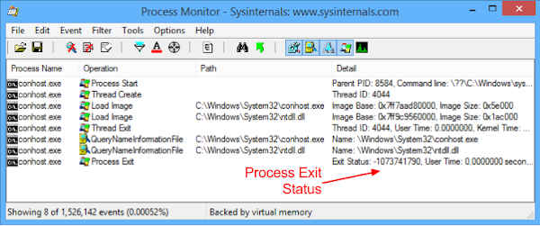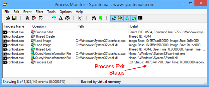 With a DLL file which can be opened by the Chrome renderer we can inject a thread, call LoadLibrary and get code executing within the process. As a first test let’s try and call AllocConsole and see what happens. If we take a look using Process Monitor we see the conhost process being created but it never executes, in fact it exits almost immediately with a negative exit status.
