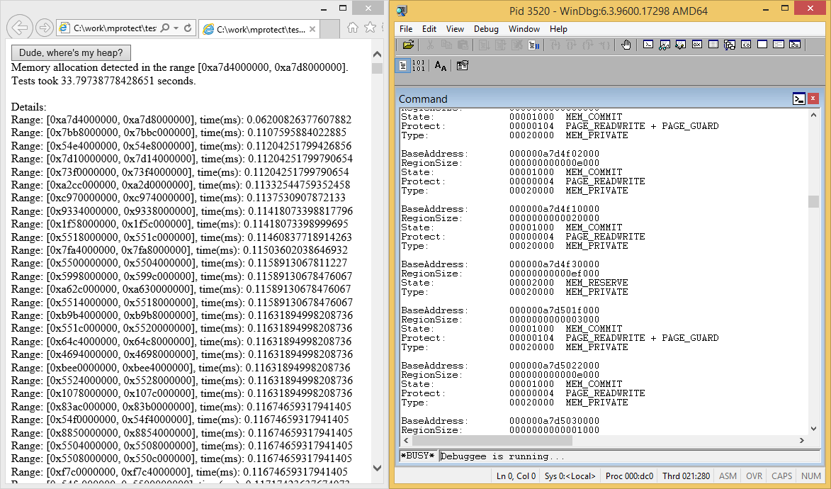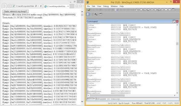 After the test run finishes, you should see the detected allocation memory range as well as detailed output of memory ranges sorted by time it took to run the experiment. By opening IE process in your favorite debugger you should be able to verify that memory allocations do indeed happen in the detected range. This is demonstrated in Figure 3.