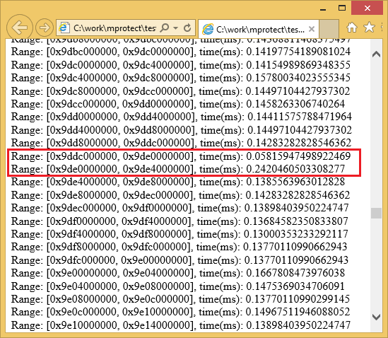 This is demonstrated in Figure 1. Notice that for memory range [0x9ddc000000, 0x9de0000000] the time it takes for MemoryProtector to run is much less than for other ranges because the block doesn’t get freed during the run. Also notice that the next run takes longer than average. This is because during this run two blocks are freed (one from the current run and one from the previous one).