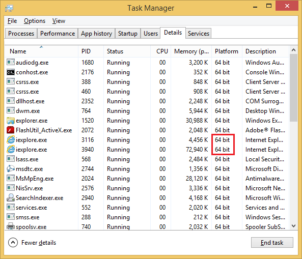 The recommended way to run IE in 64-bit mode is to enable Enhanced Protected Mode, which can be done by changing Internet Options -> Advanced -> Security -> ‘Enable Enhanced Protected Mode’ and ‘Enable 64-bit processes for Enhanced Protected Mode’. Not only will this enable additional mitigations that can be found on 64-bit Windows but will also enable additional sandboxing features, so I fully recommend that users run IE like this.