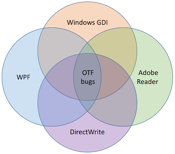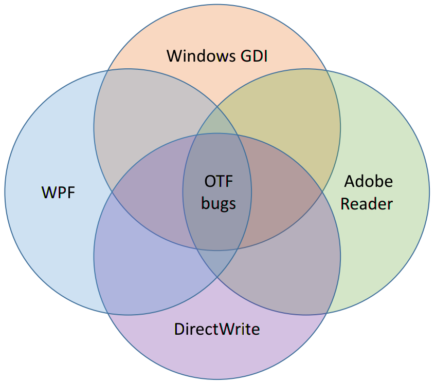As it turns out, the above historical background is quite important in the context of today's software security. Considering the extensive collaboration between vendors decades ago, a great number of modern widely used programs and systems share a common ancestor of their font rasterization code. For example, most TTF engines are based on Microsoft's original implementation of the format, including Windows GDI (win32k.sys), Microsoft GDI+, Microsoft DirectWrite, Adobe Reader and Adobe Flash. Likewise, most OTF engines are based on Adobe's original implementation, including Microsoft GDI (ATMFD.DLL), Microsoft DirectWrite, Microsoft Presentation Foundation and Adobe Reader. As a direct outcome, any bugs present in the original implementation that was later branched and included in multiple products were likely propagated, and may affect various programs or operating systems. This is of course an extremely frightful scenario, with a single 0-day vulnerability potentially being used in targeted or mass campaigns against users of different software, or chained to accomplish both remote code execution and a sandbox escape, leading to complete system compromise. Consequently, I believe that due to the high sensitivity of the code area, it deserves special attention from the security community.