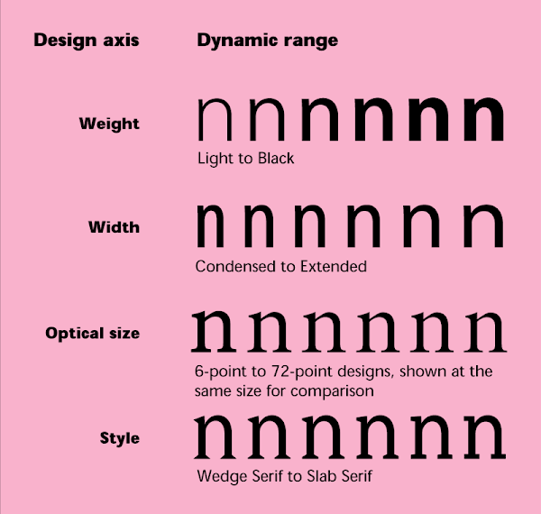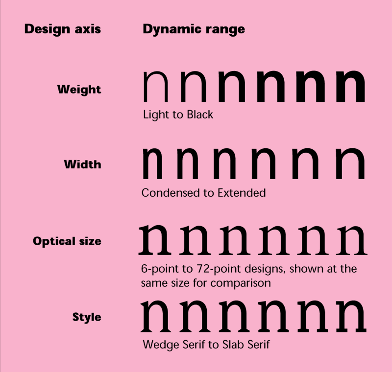 Figure 2. Examples of design axes and dynamic ranges in multiple master typefaces (source: http://blog.typekit.com/2014/07/30/the-adobe-originals-silver-anniversary-story-how-the-originals-endured-in-an-ever-changing-industry/)