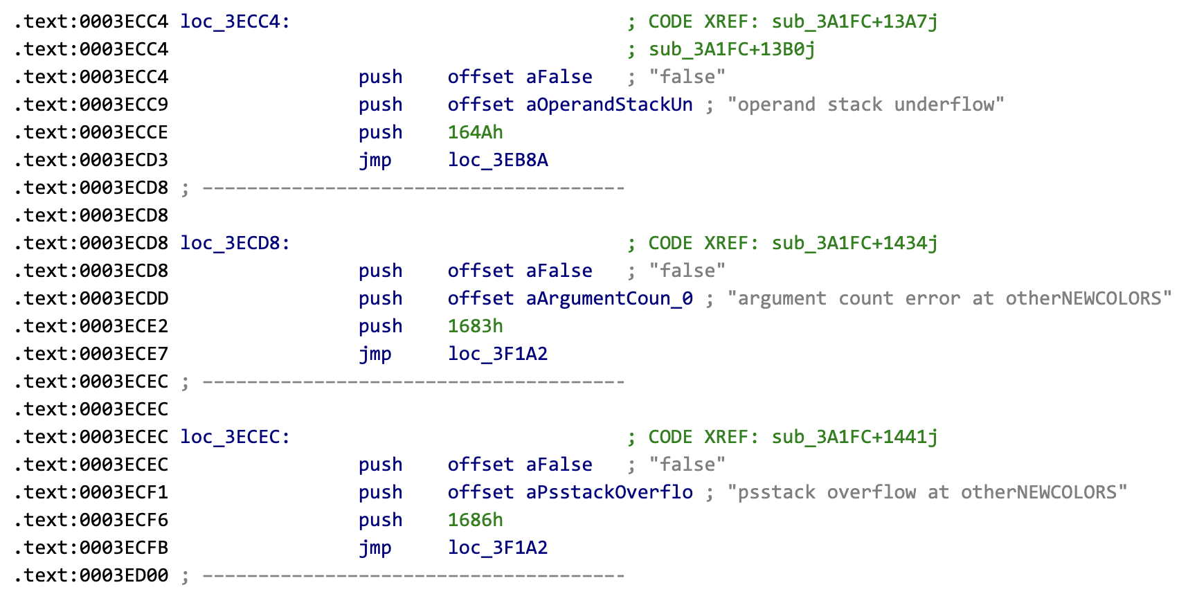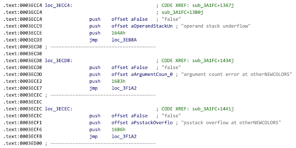 ... and many others. All this information makes it relatively easy to spot the target we are after in this research - the Charstring processing routine - as it directly references many such Charstring related debug strings: