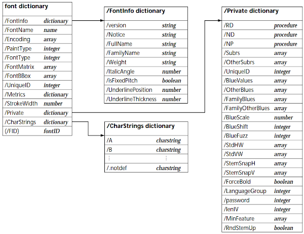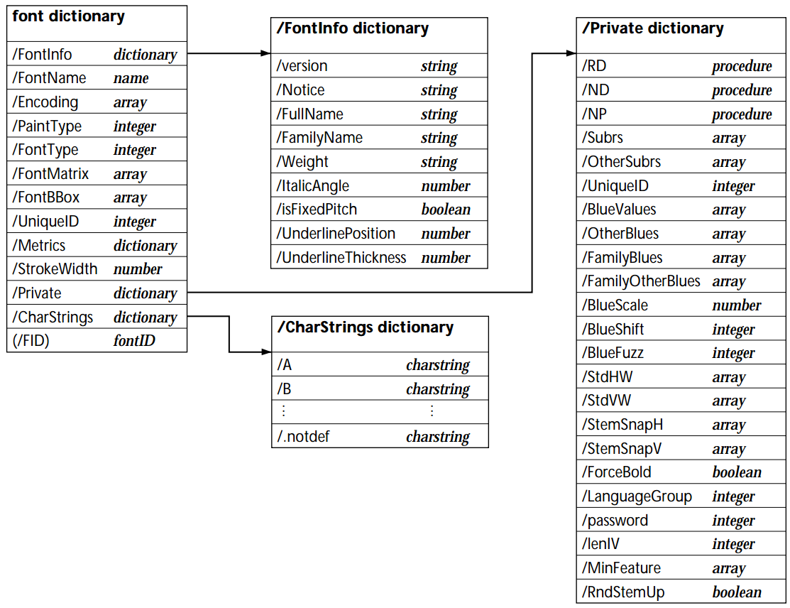 Figure 4. Typical dictionary structure of a Type 1 font (source: Adobe Type 1 Font Format, Adobe Systems Inc.)