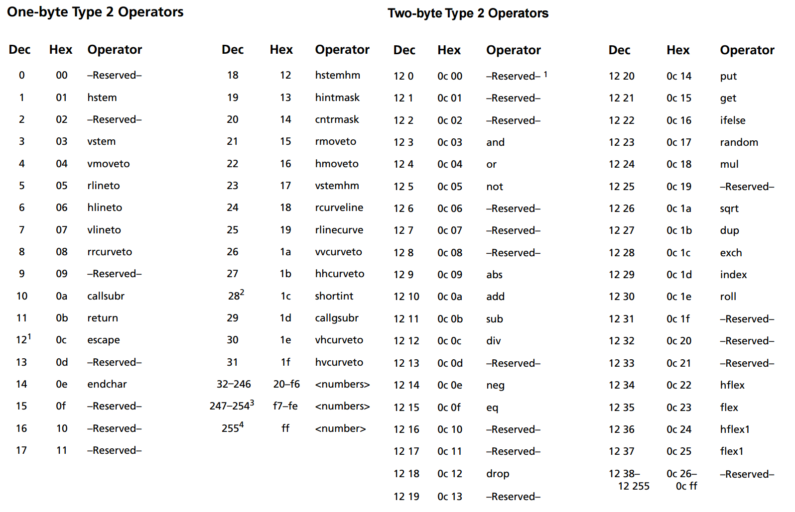 A full listing of Type 2 Charstring operators defined in the latest revision of the specification is shown in Figure 6.