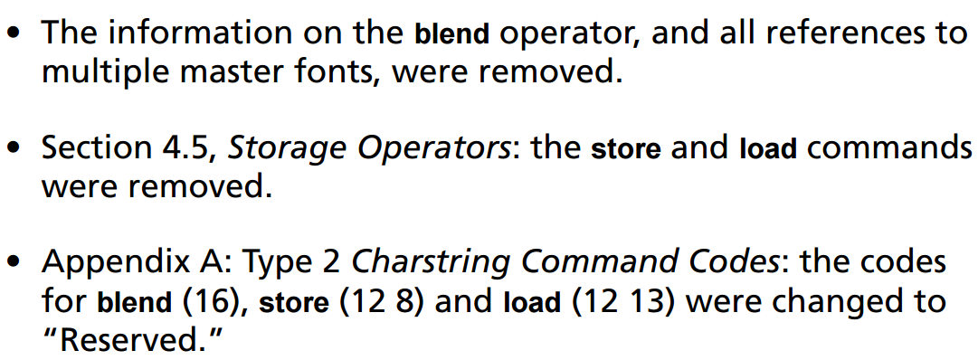 In order to understand the vulnerability being the main subject of the post, we first have to get a grasp on the functionality it was discovered in – the “blend” PostScript operator. It is strongly related to the forgotten Multiple Masters font extension, and was originally introduced in the “The Type 2 Charstring Format” document on 5 May 1998. It was the time when “Multiple Masters” - originally an extension of Type 1 PostScript fonts - was also considered as an addition to the new OpenType/CFF format, resulting in a number of MM-related operators added to the 1998 revision of the Charstring specification (together with new fields introduced into the CFF format). However, since the idea of OpenType/MM was not widely adopted (with just a few such fonts ever coming into existence, none of the publicly used), all references to Multiple Masters were soon removed from the document on 16 March 2000, as shown in the excerpt in Figure 9.
