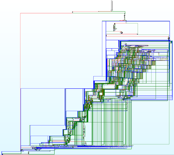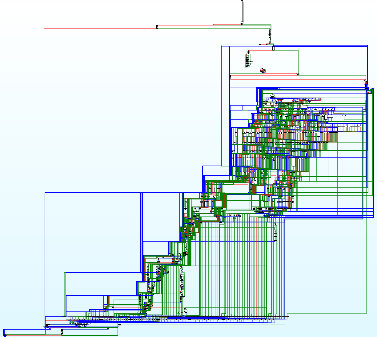 Incidentally, the function is also by far the largest one in the DLL file, with a size of more than 20kB, while the second largest routine is “only” 4kB long. The magnitude and complexity of the function is best illustrated by a control flow graph, as presented in Figure 8. In order to display the graph, the maximum number of nodes in IDA had to be increased from the default value of 1000.