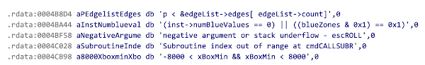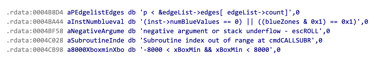 There are also other sorts of information included in the Adobe Type Manager which can help us find our way in the assembly – the font driver is full of debug messages which contain a variety of information, like local/global variable names, function names, expressions used in the code and source file paths. Additionally, we can also find a number of string literals related to Type 1 fonts (e.g. names of dictionary fields) which reveal the locations of functions dealing with those entries through their cross-references in the DLL. Examples of such useful strings are shown below: