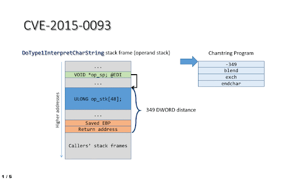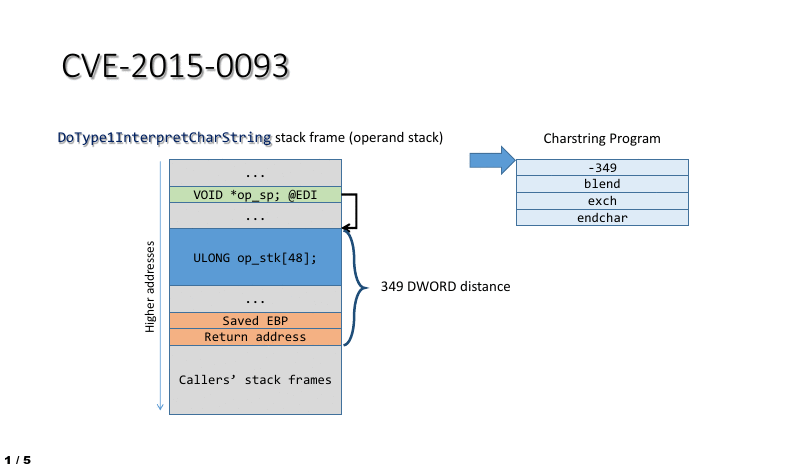 To make a long story short, the one vulnerability mentioned in the title is CVE-2015-0093 (also dubbed CVE-2015-3052 by Adobe). What makes it unique is the fact that it provides an extremely powerful primitive, making it possible to perform arbitrary PostScript operations (e.g. arithmetic, logic, conditional and other) anywhere on the exploited thread’s stack, with full control over what is overwritten and how. This, in turn, could be used by an attacker to craft a self-contained malicious Type 1 font which, once loaded in the vulnerable environment, reliably and deterministically builds a ROP chain in the Charstring program, consequently defeating all modern exploit mitigations techniques such as stack cookies, DEP, ASLR, SMEP and so on. It also affected both Adobe Reader and the Windows kernel (32-bit), enabling the creation of a single PDF file, which would first achieve arbitrary code execution within the PDF viewer’s process, and further escape the sandbox by exploiting the very same bug in the operating system, elevating chosen process’ privileges in the system and removing the associated job’s restrictions.