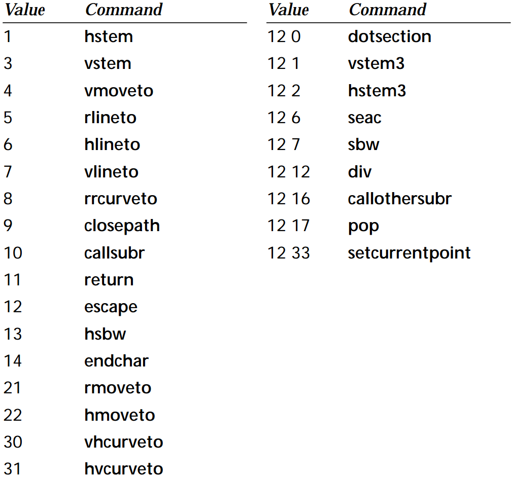 Figure 5. Currently documented Charstring commands (source: Adobe Type 1 Font Format, Adobe Systems Inc.)