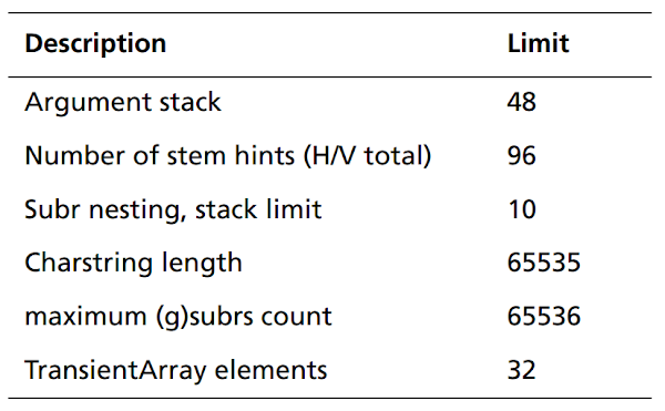 Figure 7. Implementation limits of Type 2 Charstring interpreters (source: The Type 2 Charstring Format, Adobe Systems Inc.)