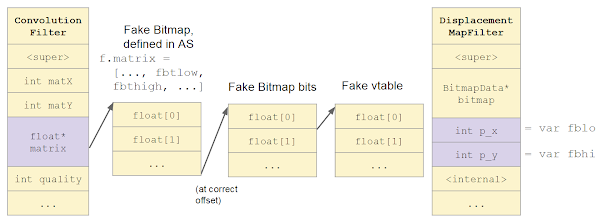 The first step is creating a fake vtable and determining its address using ConvolutionFilter/DisplacementMapFilter confusion.
