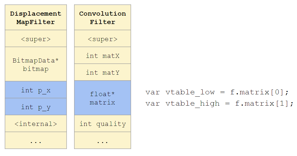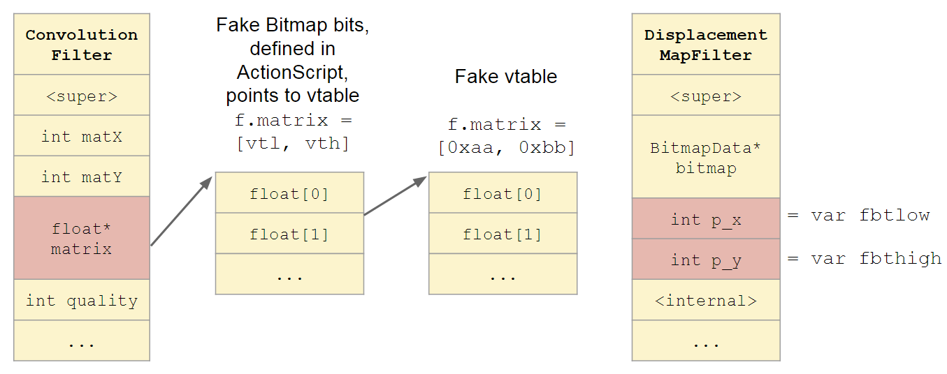 To set the pointer, I confused a ConvolutionFilter object with a DisplacementMapFilter object (not the same DisplacementMapFilter as used above!) and set the mapPoint property to the pointer location of the BitmapData object above. The mapPoint property is a point with x and y coordinates that are both integers (p_x and p_y in the figure below) that line up with the matrix pointer in the ConvolutionFilter, which made it easy enough to set this value. It was then possible to read the vtable from the BitmapData object by reading the matrix array from the ConvolutionFilter object (note that the object had to be confused to a DisplacementBitmapFilter and then confused back to a ConvolutionFilter to allow this).