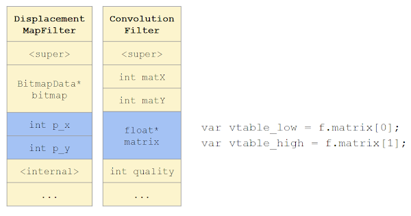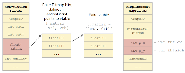 Using the float converters implemented above, the vtable address can then be converted to an integer. Now we need to gain code execution using this address. An easy way to move the instruction pointer is to overwrite a vtable of an object (or a pointer to an object that has a vtable). This can be done by confusing the ConvolutionFilter matrix array with the DisplacementFilter BitmapData pointer.