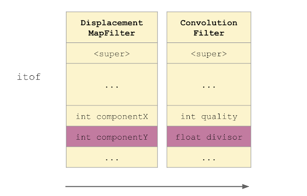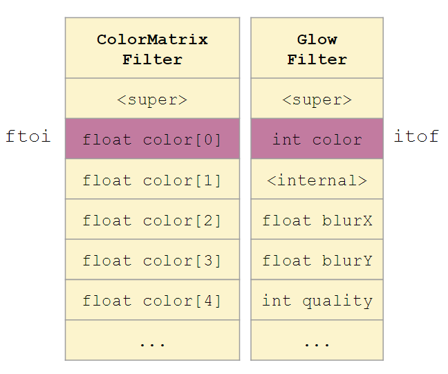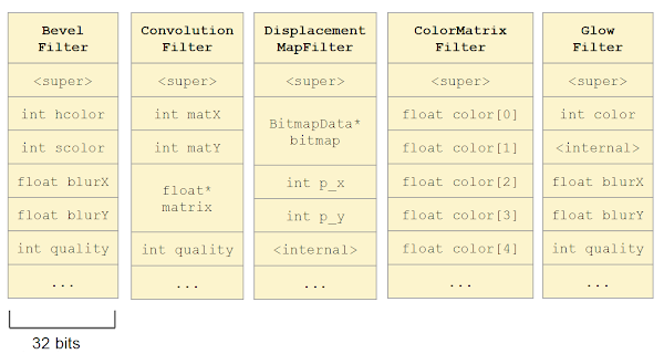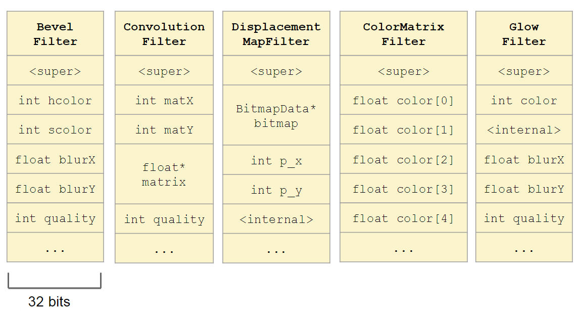 The end result of this is that the fields of the ConvolutionFilter can be accessed (read or written) as if it was a BlurFilter, and likewise for any other filter type. This allows a wide array of manipulation that is useful for exploitation.