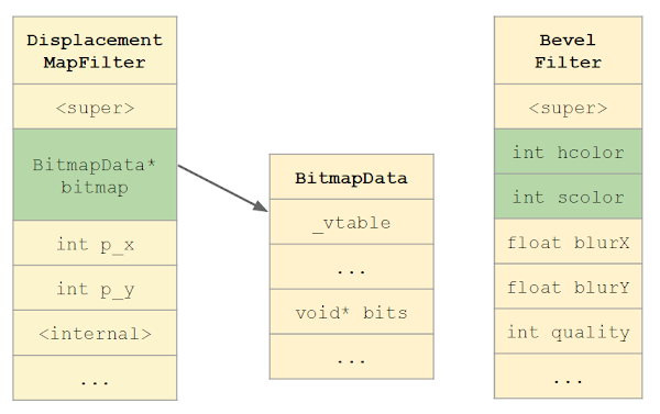The first step was to bypass ASLR by determining the address of a vtable. An ideal way to do this would be to confuse an object with a vtable with an object with a member overlapping the vtable that can be manipulated, but all filter objects have vtables at the same offset. Instead, I used the BitmapData object in DisplacementMapFilter to determine the vtable address.