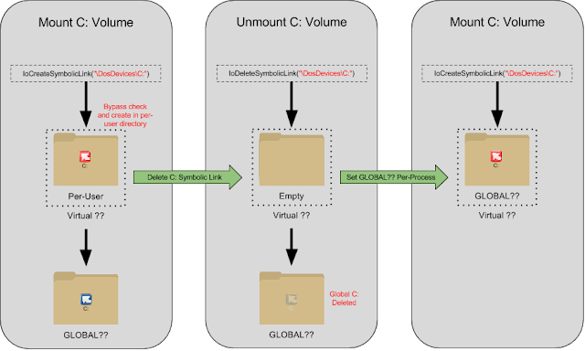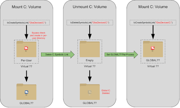 - Assign GLOBAL?? as the per-process DosDevices directory, remount the volume as the letter to override.