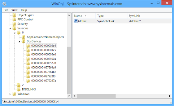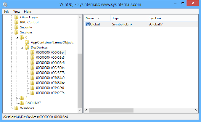The biggest change, however, happened in Windows XP (well technically with the introduction of Terminal Services but XP was the first consumer OS with this support). XP shipped with Fast User-Switching and remote desktop support, which allowed multiple interactive users to be logged in the same machine at the same time. This required that DosDevices supported per-user objects, because it would be annoying and potentially dangerous to allow the sharing of user specific drive mapping. To achieve this a per-user object directory is created under \Sessions\0\DosDevices with a name which corresponds to the user’s logon ID.