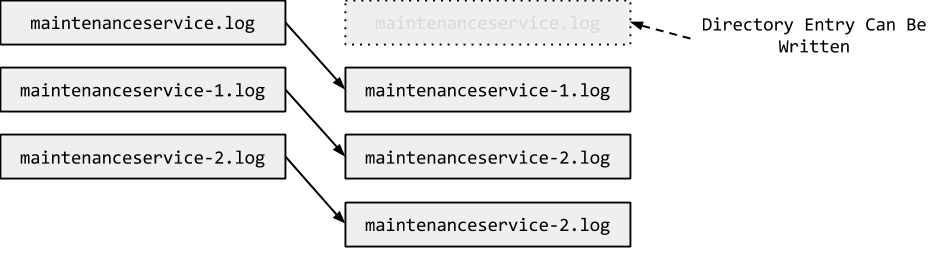 Fortunately if we look at the code there’s a window of opportunity, before creating the log file a call is made to the BackupOldLogs function. This function moves each log file to a new numbered log, this ends up freeing up the initial log directory entry for a brief window of time as shown below.