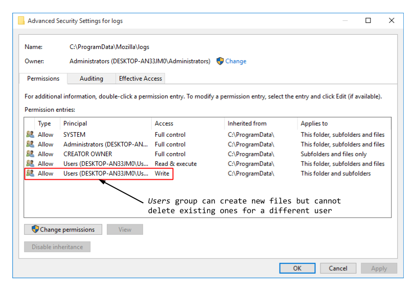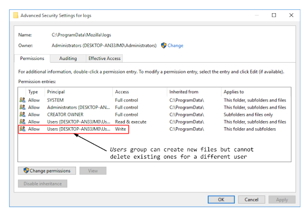 When an update process is started by the user application the service writes out a status log to the directory C:\ProgramData\Mozilla\logs under the name maintenanceservice.log. This is interesting as ProgramData’s default permissions allow a normal user to create new files in its subdirectories. There is a problem, however: if we look at the permissions on the logs directory (shown below), while any user can create a new file only the owner, through the CREATOR OWNER SID, gets permission to delete it. This means we can’t just delete the log file and replace it with a hard link as the owner is SYSTEM.