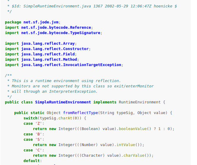 This SimpleRuntimeEnvironment class is used by JODE to deobfuscate strings by dynamically executing some of the bytecode. This code in particular attempts to handle method invocation in static constructors.