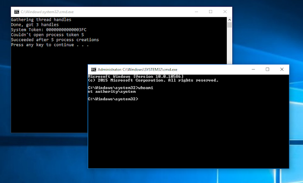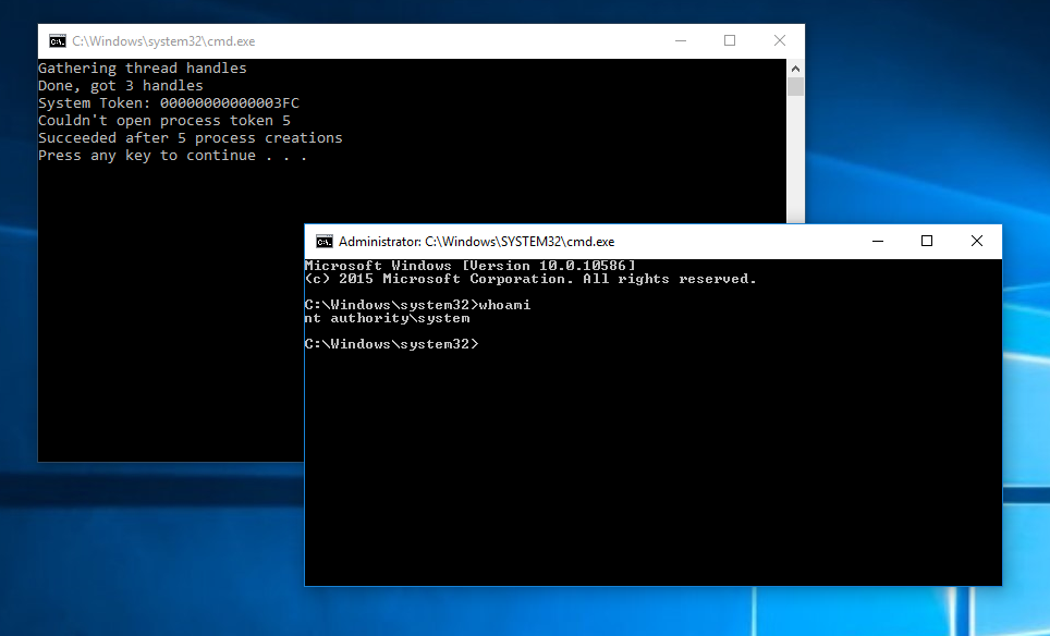 Hopefully I’ve demonstrated an interesting way of exploiting a leaked thread handle in a privileged service. Of course it just happened that the leaked thread handle was used for a service which directly gave us control over process creation, but this same technique could be used for creating arbitrary files or other resources. Just because you can exploit a vulnerability like this using memory corruption techniques, it doesn’t mean that you have to.