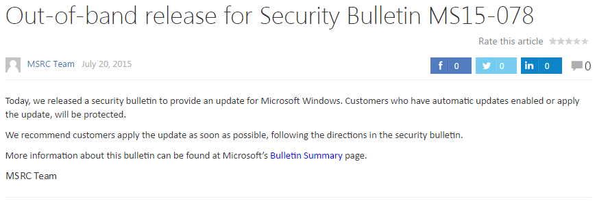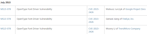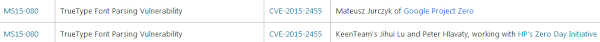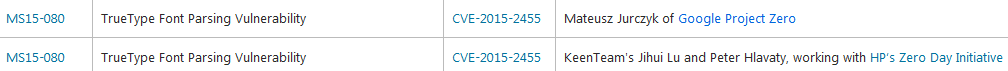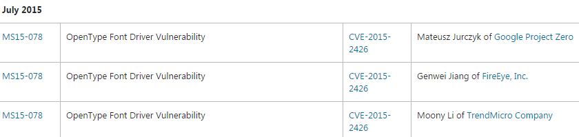 After reporting the first batch of crashes to Microsoft in May 2015 (7 OpenType and 4 TrueType bugs), we patiently waited for the vendor to release corresponding patches. Very soon, we were informed that they managed to reproduce all of the problems, and scheduled the fixes for the August Patch Tuesday. However on July 20, in the middle of my vacation, I noticed that an out-of-band MS15-078 security bulletin was released that day: