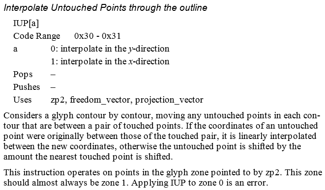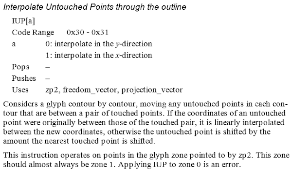 As for the technical details, the bug existed in the implementation of the "IUP" instruction, which translates to Interpolate Untouched Points through the outline in the TrueType instruction set specification: