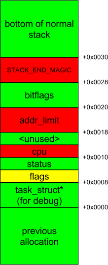 Since it is hard to find anything worth targeting in the thread_info struct (and because it would be nice to show that moving stuff out of thread_info is not a sufficient mitigation), I chose a different strategy: Overflow the stack into an allocation in front of the stack, then exploit the fact that the stack and the other allocation overlap. The problem with this approach is that the canary and some components of the thread_info struct must not be overwritten. The layout looks like this (green is fine to clobber, red must not be clobbered, yellow might be unpleasant if clobbered depending on the value):