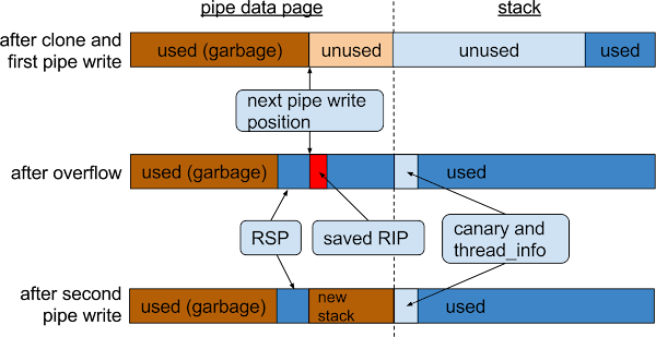 For the preceding allocation, my exploit uses pipes. When data is written to a newly allocated empty pipe, a page will be allocated for that data using the buddy allocator. My exploit simply spams the memory with pipe page allocations while creating the process that will trigger the pagefault using clone(). Using clone() instead of fork() has the advantage that with appropriate flags, less information has to be duplicated, so there is less memory allocation noise. During clone(), all of the pipe pages are filled up to, but excluding, the first saved RIP behind the expected RSP of the recursing process when it pauses in FUSE. Writing less would cause the second pipe write to clobber stack data that is used before RIP control is achieved, potentially crashing the kernel. Then, when the recursing process has paused in FUSE, a second write is performed on all pipes to overwrite the saved RIP and the data behind it with a completely attacker-controlled new stack.