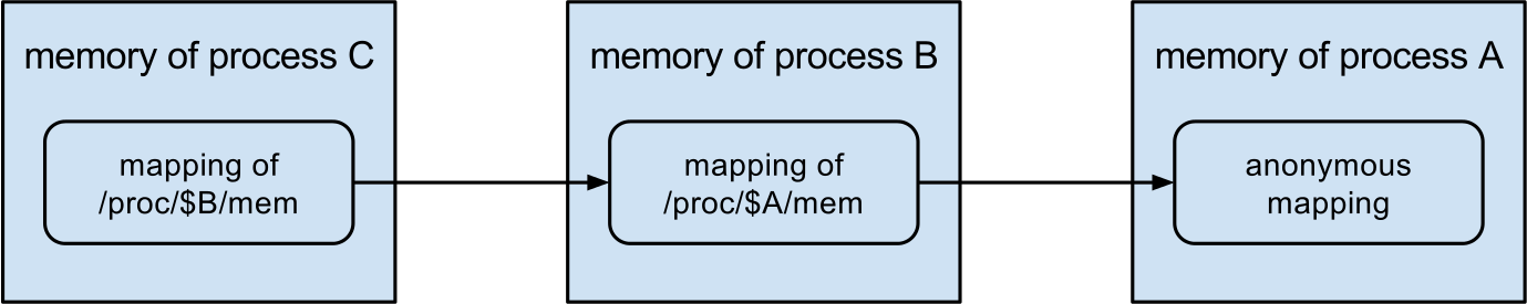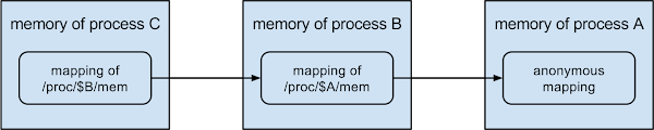 Then, assuming that the /proc/$pid/mem mappings would have to be faulted in, a reading pagefault on the mapping in process C would cause pages to be faulted in from process B, which would cause another pagefault in process B, which in turn would cause pages to be faulted in from the memory of process A - a recursive pagefault.