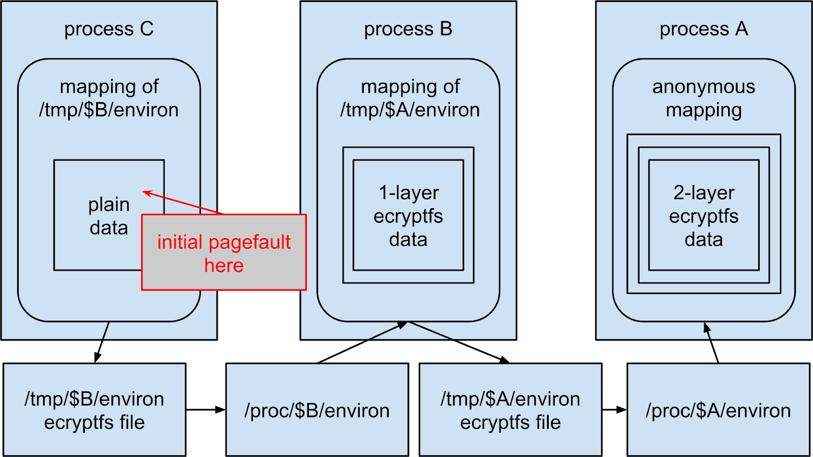 If a valid encrypted ecryptfs file is loaded into the memory of process A and its environment area is then configured to point to that area, the decrypted view of the data in the environment area becomes accessible at /tmp/$A/environ. This file can then be mapped into the memory of another process, process B. In order to be able to repeat the process, some data has to be encrypted with ecryptfs repeatedly, creating an ecryptfs matroska that can be loaded into the memory of process A. Now, a chain of processes that map each other's decrypted environment area can be set up: