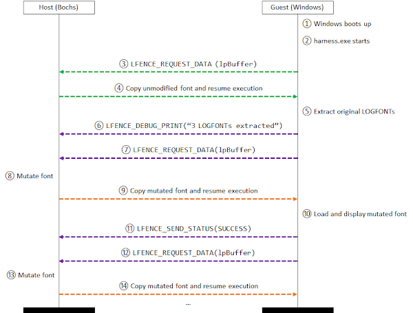 - REQUEST_DATA(lpBuffer) – sent by the harness to receive fresh font data to test the kernel against. The lpBuffer argument contains a virtual address of the buffer where data should be copied by the hypervisor.