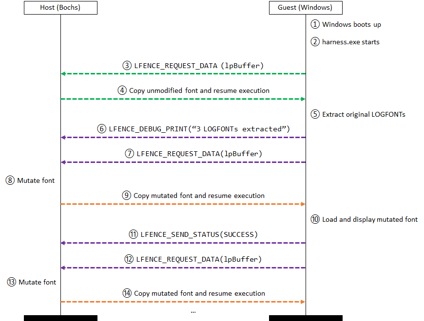 In addition, the data received in response to the first REQUEST_DATA message was always the original, non-mutated data of the sample file. This was to make it possible for the harness to extract valid LOGFONT structures describing fonts contained within the file, which were then used to load and display them in all subsequent iterations. The workflow is illustrated in the diagram below: