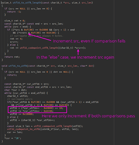 The bug is quite straightforward, and since it’s quite readily fuzzable, it’s interesting that it’s been undiscovered for so long. The vulnerable code is in libutils, and is in the conversion between UTF16 and UTF8. This code is used in many places, including the android::String8(const android::String16&) constructor.
