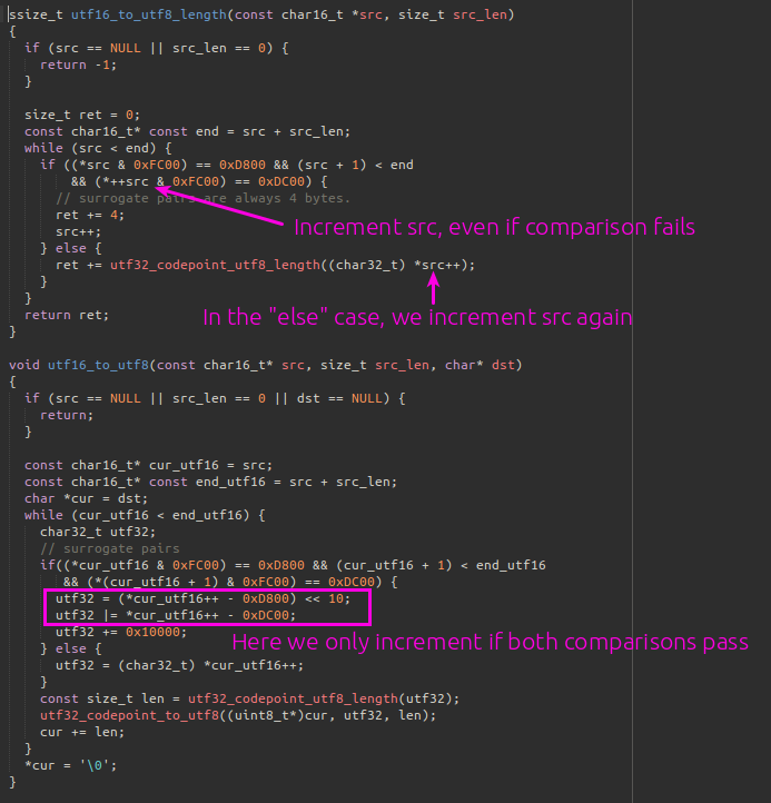 There are two functions in libutils/Unicode.cpp that need to match up; the first, utf16_to_utf8_length is used to compute the size of buffer needed to hold the UTF8 string that will be the result of converting the source UTF16 string, and utf16_to_utf8 performs the conversion. These functions are intended to be used together, to first allocate a buffer of the required size and then convert, and so it is obviously important that they agree on how many bytes of output are needed…