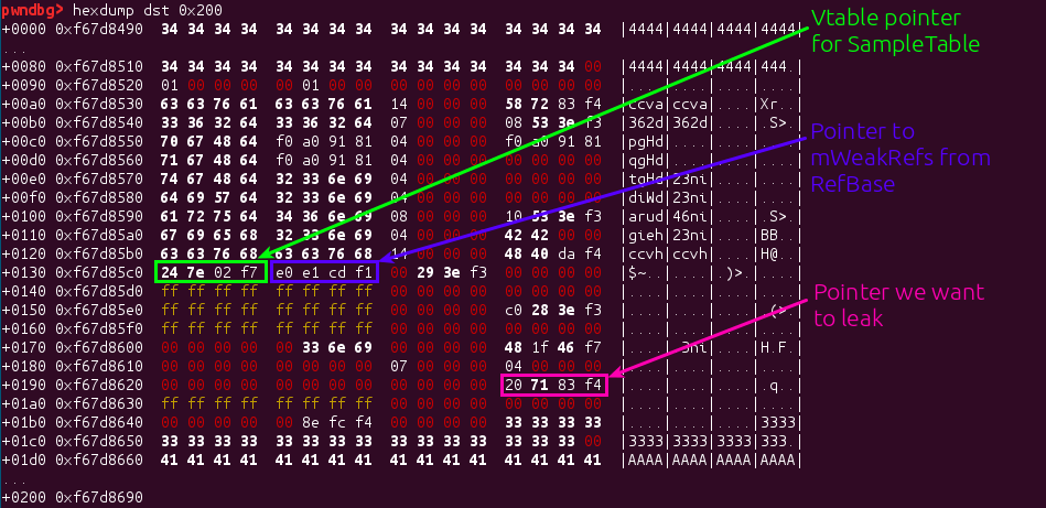 As you can see from the labels, there are a few things of note; the SampleTable vtable pointer is of no consequence to us - we can safely dispose of the SampleTable without calling any methods on it, just as long as we never decrement it’s refcount to 0; but the mWeakRefs pointer inherited from RefBase is a serious problem for us; this needs to be a pointer to somewhere that can be safely decremented and not result in a 0 refcount. Here’s where we will reuse the valid UTF8 pointer we leaked above.