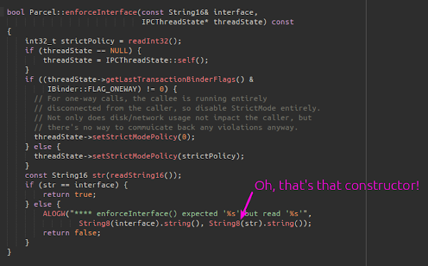 The first nice place I found is the following piece of code (in Parcel.cpp), which is interesting because the generated code for every* system service on an Android device calls this function on every parcel it receives. So, this should give us a privilege escalation from the untrusted_app context into any binder service we fancy; there are plenty of choices, but since there are so many inside system_server, why go anywhere else?